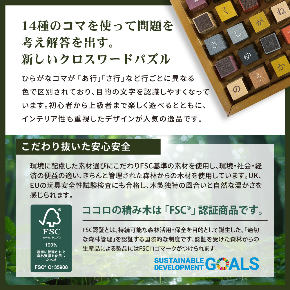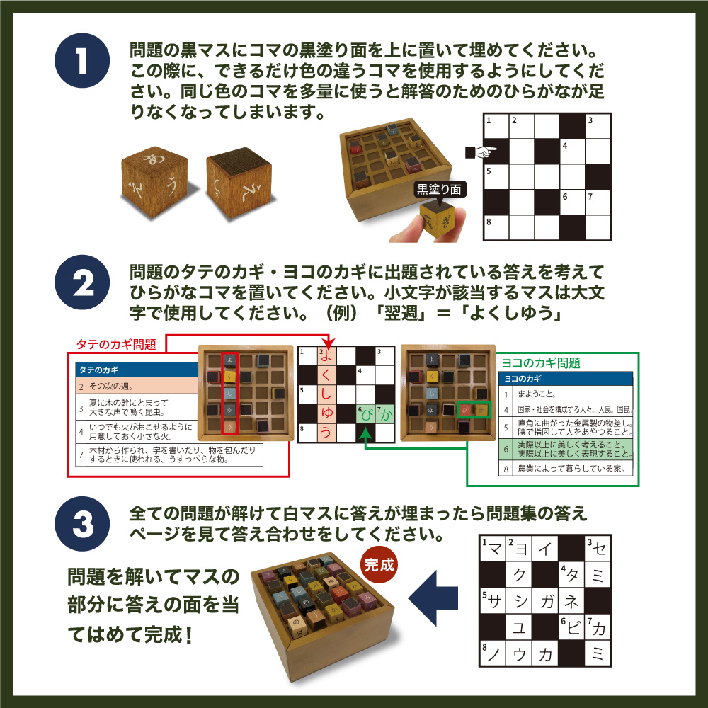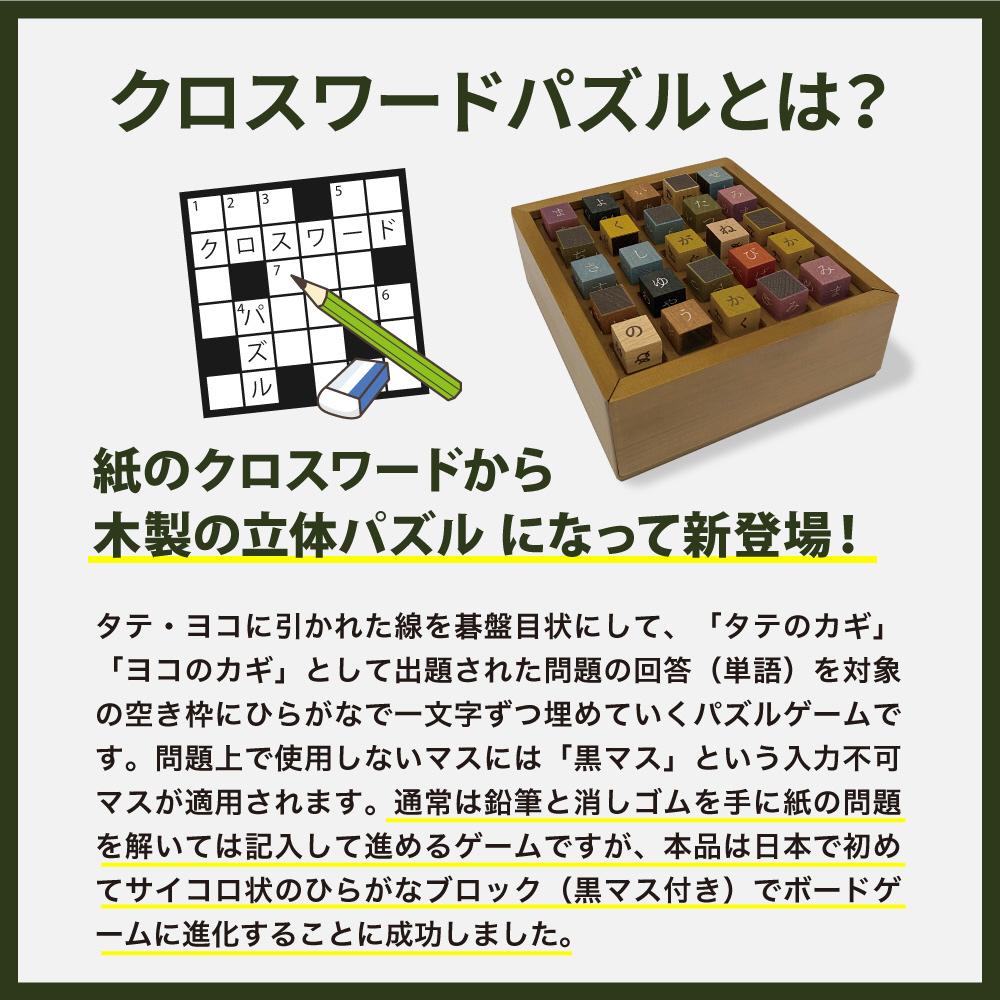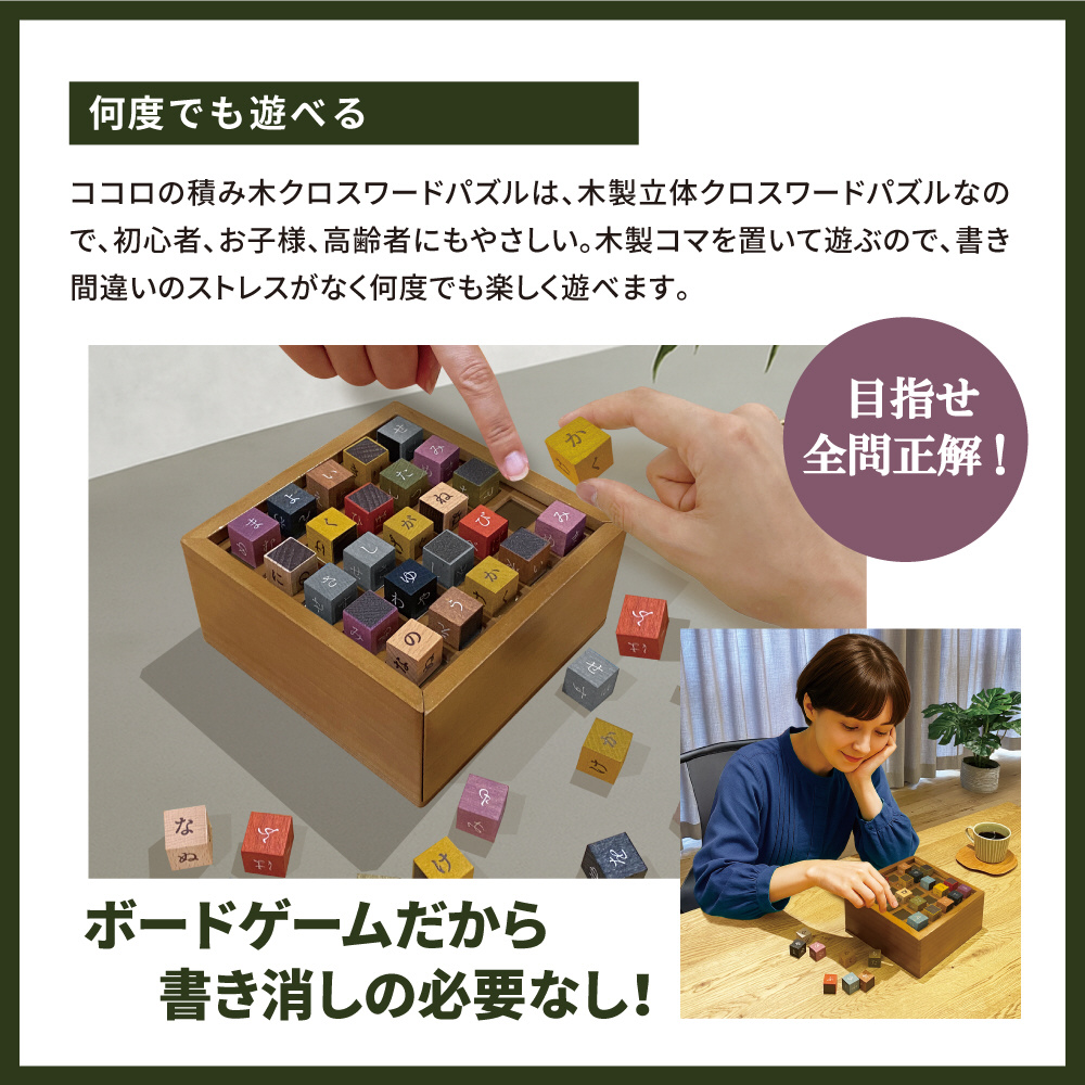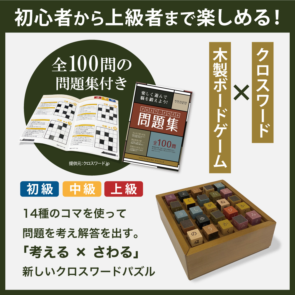 木製で楽しめる”クロスワードパズル”。筆記用具いらずで、コマを使って遊ぶので、間違えても何度でも簡単にやり直せます。一人でコツコツやるのも良し、みんなでワイワイやるのも良し。全100問の問題集付きです。