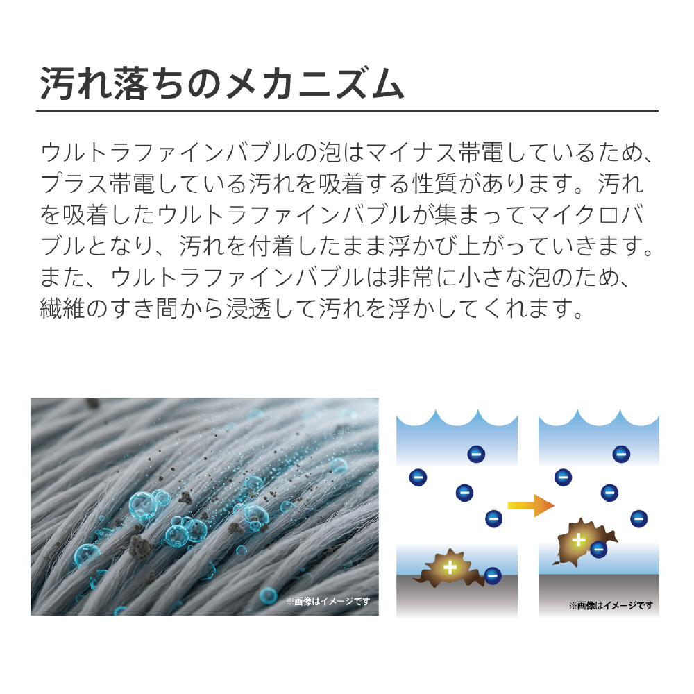 ウルトラファインバブルはマイナスに帯電しており、プラスに帯電した汚れに吸着します。