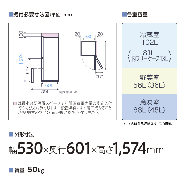 据付必要寸法(幅×高さ×奥行)mm 570×1674×601mm