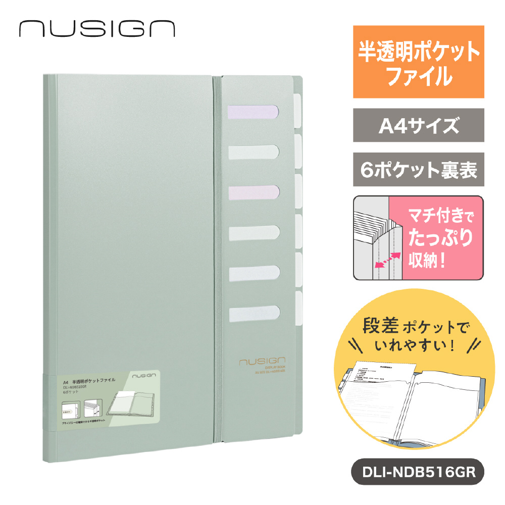 半透明ポケットファイル A4 6ポケット インデックス付き nusign(ニューサイン) 緑 DLI-NDB516GR