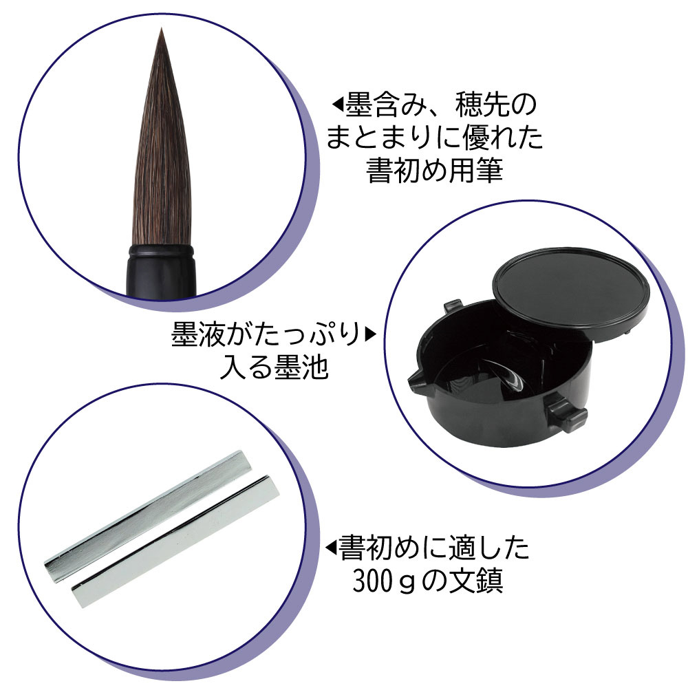 書初め用筆、名前書き用筆、下敷、下敷収納ケース、ツイン文鎮、墨液(180mL)、墨池、筆巻、筆の説明書