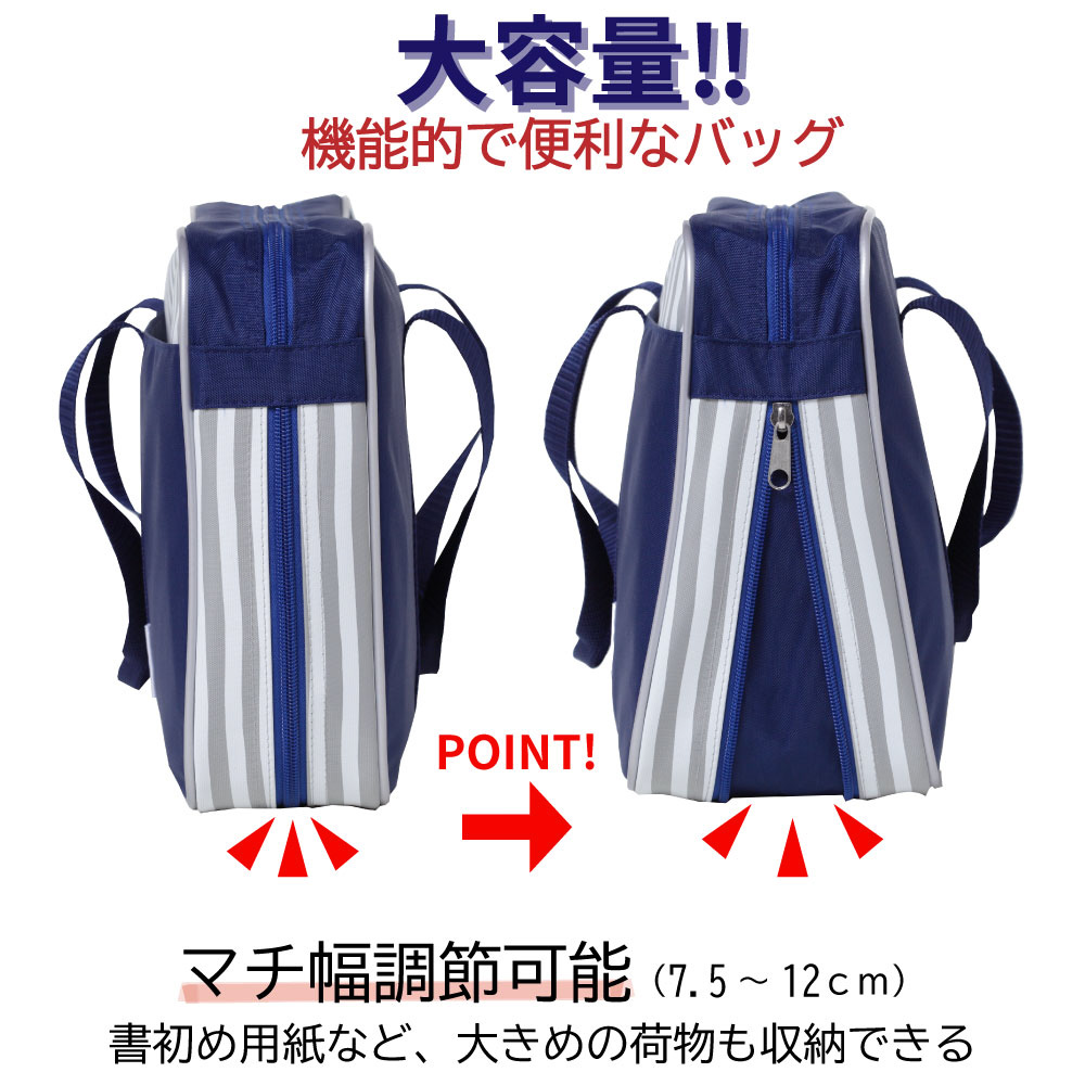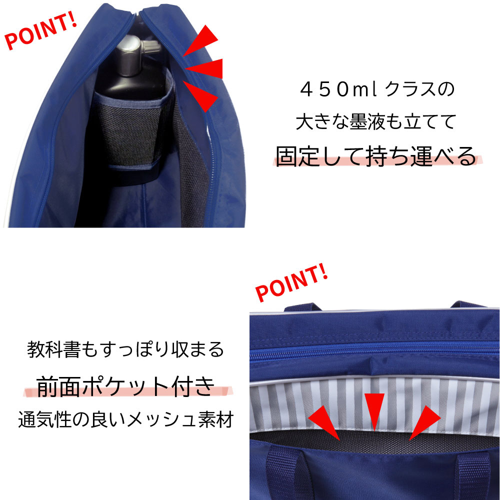 ファスナーでマチ幅調整、大きな墨液が固定できるベルト、前面ポケットなど、書初め用品がらくらく入り、扱いやすい工夫がされています。