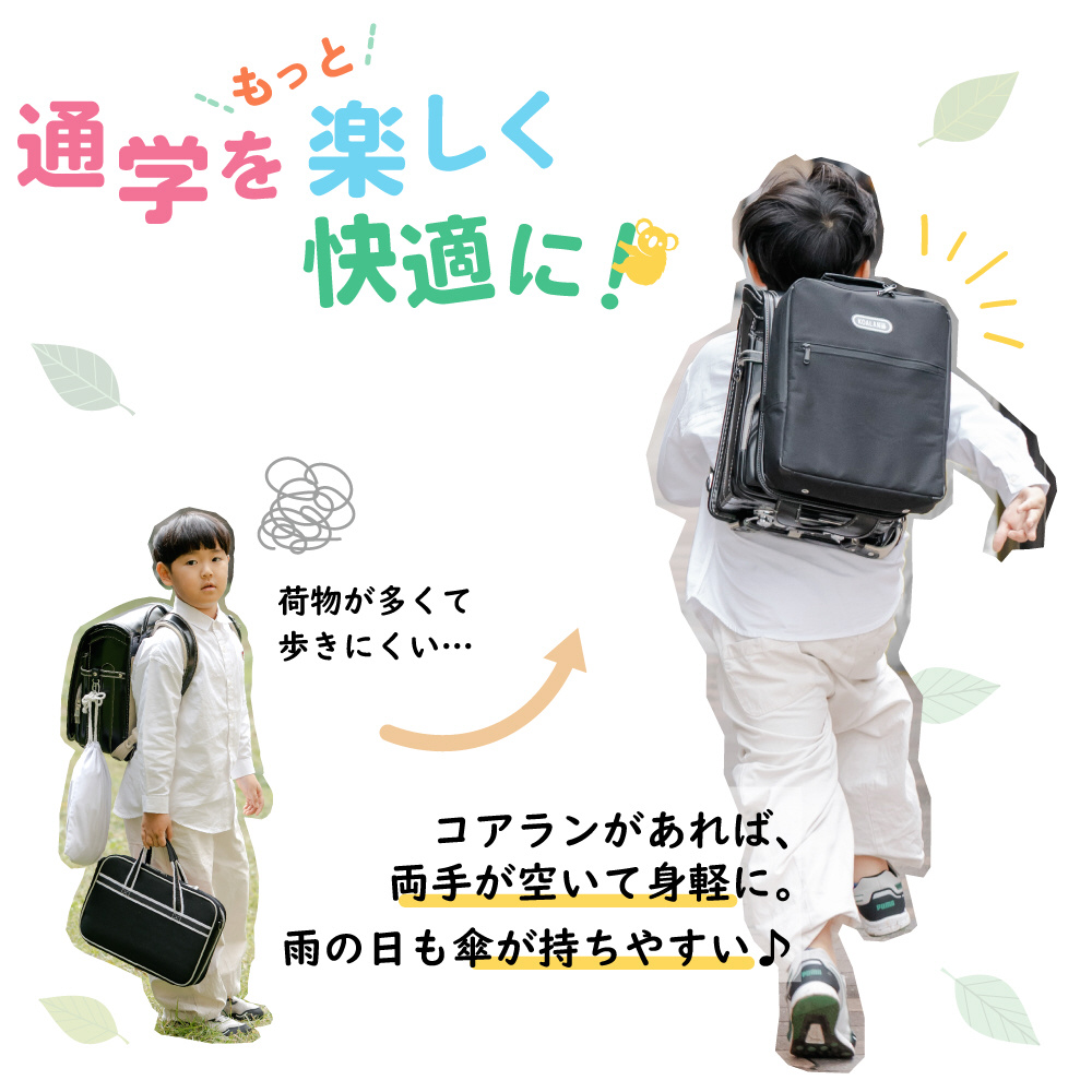 ・ランドセルに取り付け可能で、両手が空くからスッキリらくらく。