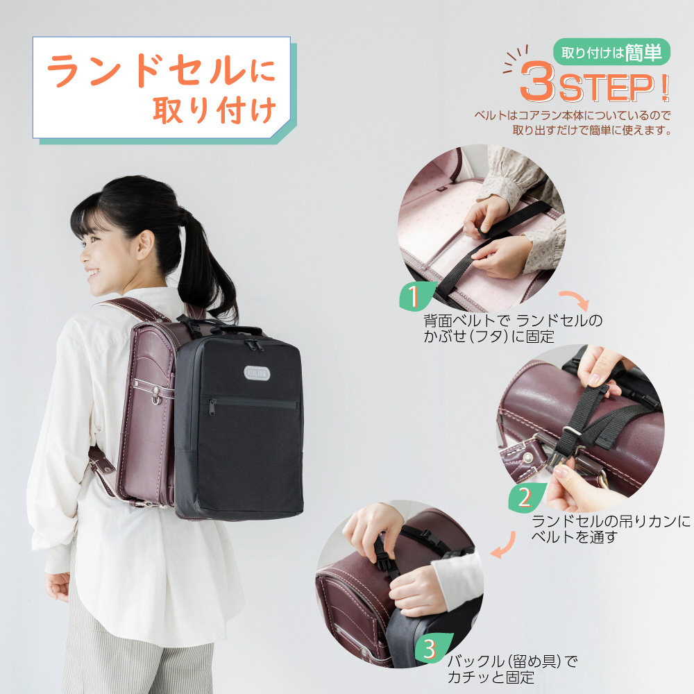 かぶせが短めのランドセルは、コアランの固定が難しい場合があります。
