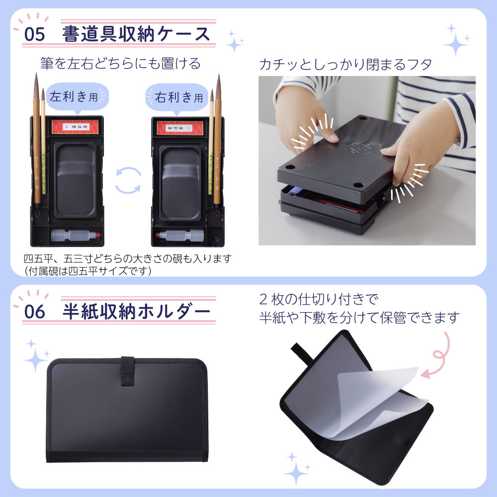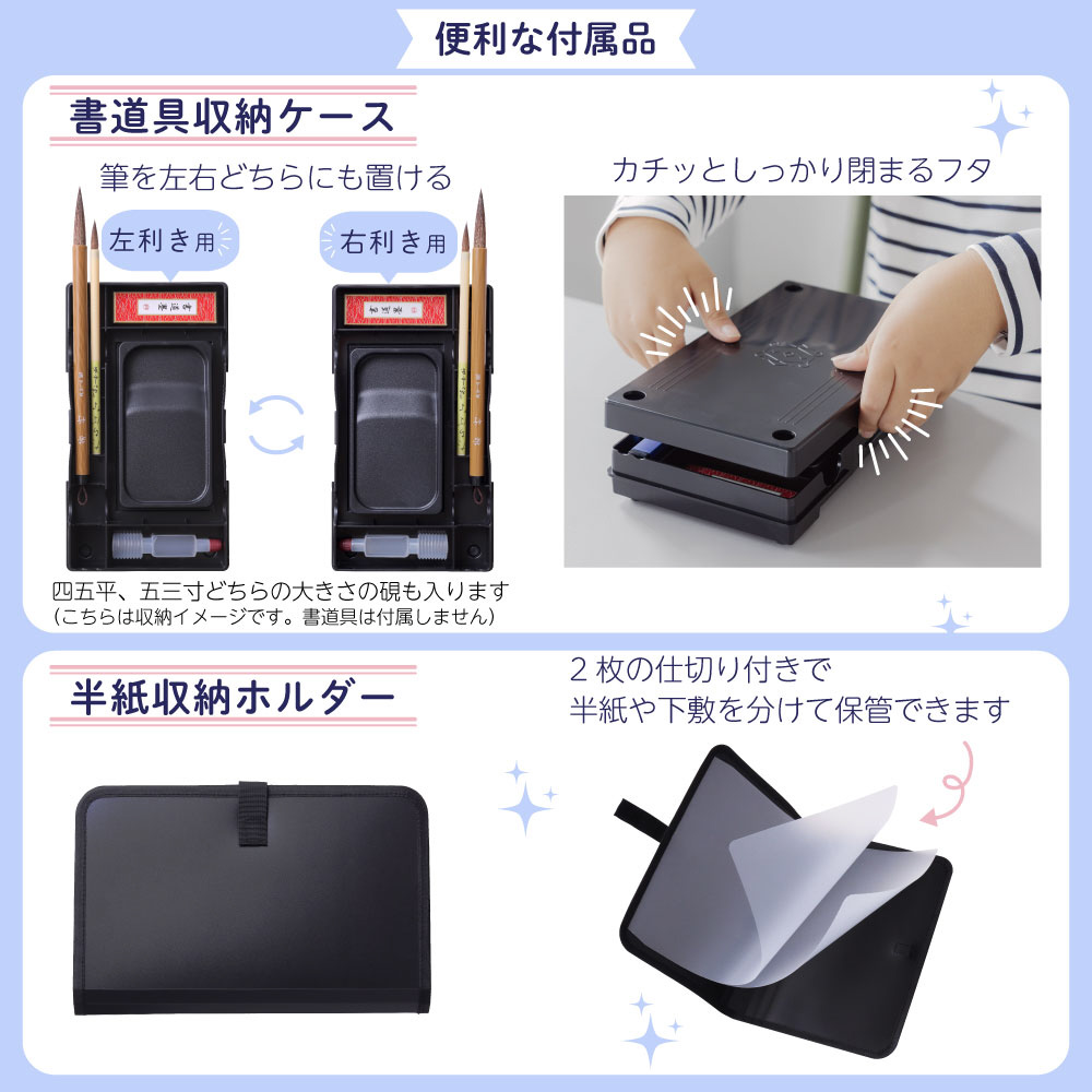 半紙収納ホルダー、書道具収納ケース(左右両用・筆置き兼用)、ショルダーベルト