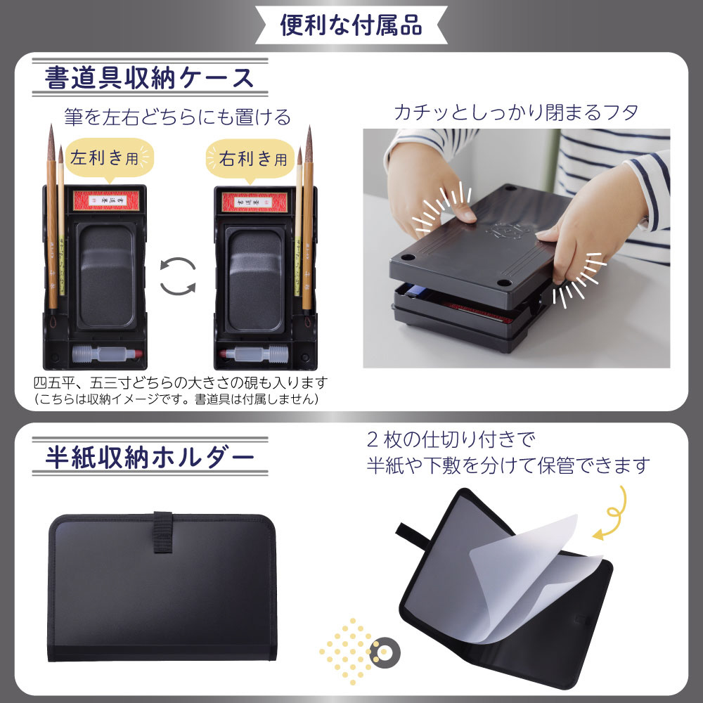 半紙収納ホルダー、書道具収納ケース(左右両用・筆置き兼用)、ショルダーベルト