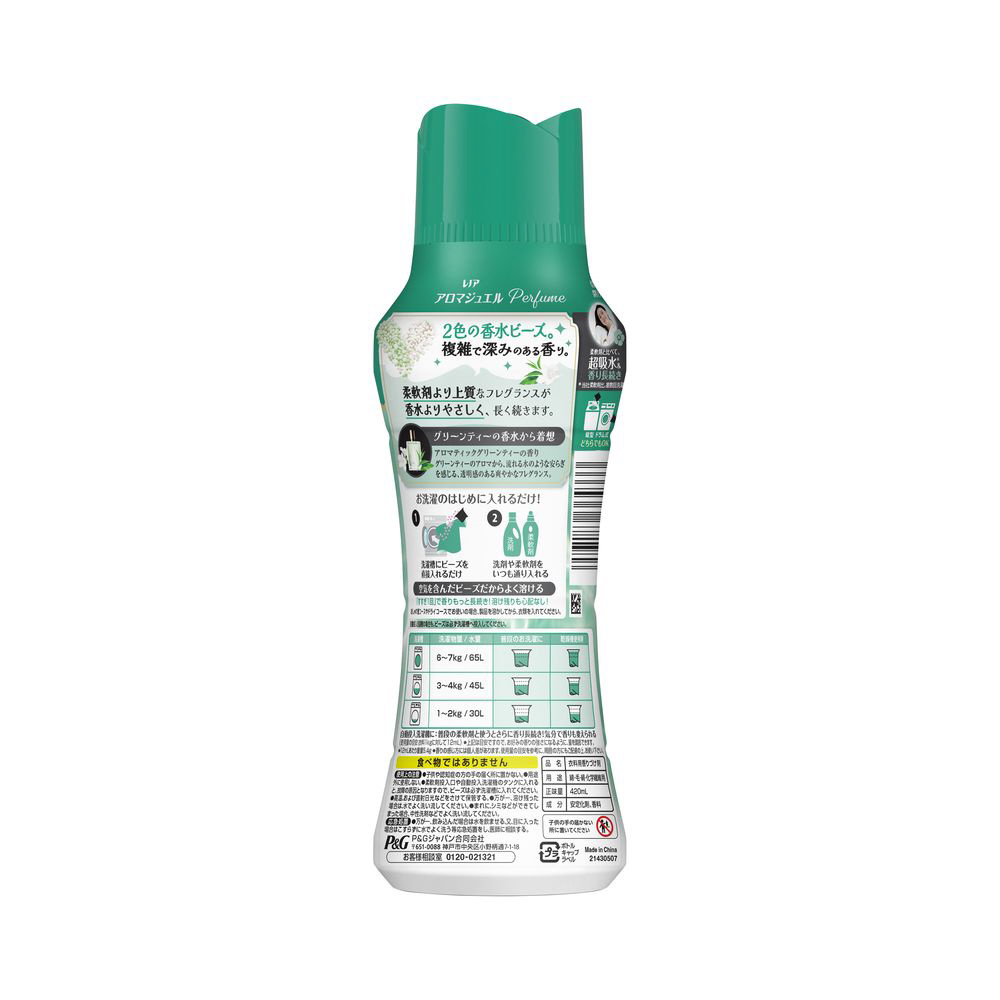柔軟剤と比べて、超吸水力*&香り長続き2色の香水ビーズ。複雑で深みのある香り。柔軟剤より上質なフレグランスが香水よりやさしく、長く続きます。グリーンティーの香水から着想 アロマティックグリーンティーの香り グリーンティーのアロマから、流れる水のような安らぎを感じる、透明感のある爽やかなフレグランス。お洗濯のはじめに入れるだけ!縦型・ドラム式どちらでもOK* 当社柔軟剤比。複数回洗濯後。 香り付け専用ビーズ