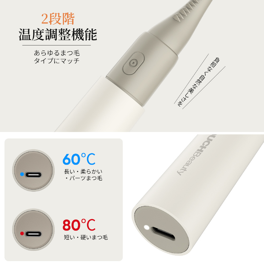 温度調節は約60℃/80℃の2段階。約60℃はナチュラルなカールを、約80℃は華やかなカールを作ります。つけまつ毛にもご使用いただけます。