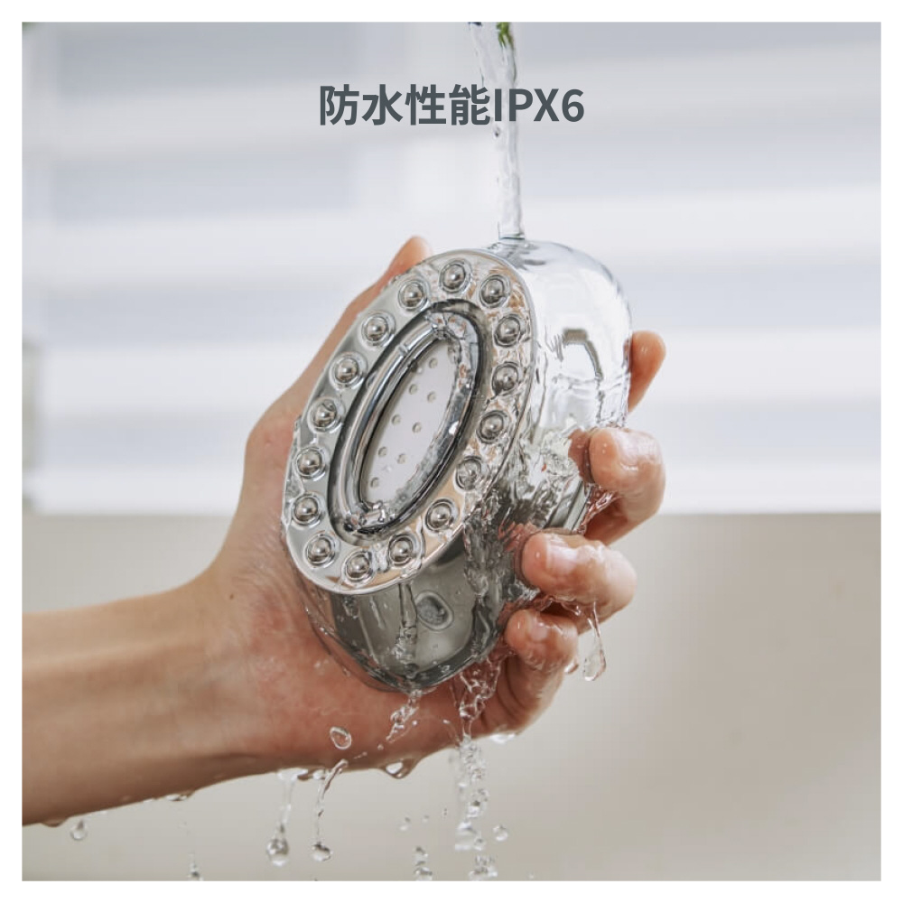 本体はIPX6の防水仕様(※充電ベース除く)。入浴中の蒸気や、水しぶきも気にせず使用でき、ボディケア後は水洗いが可能なため、いつでも清潔にご使用いただけます。