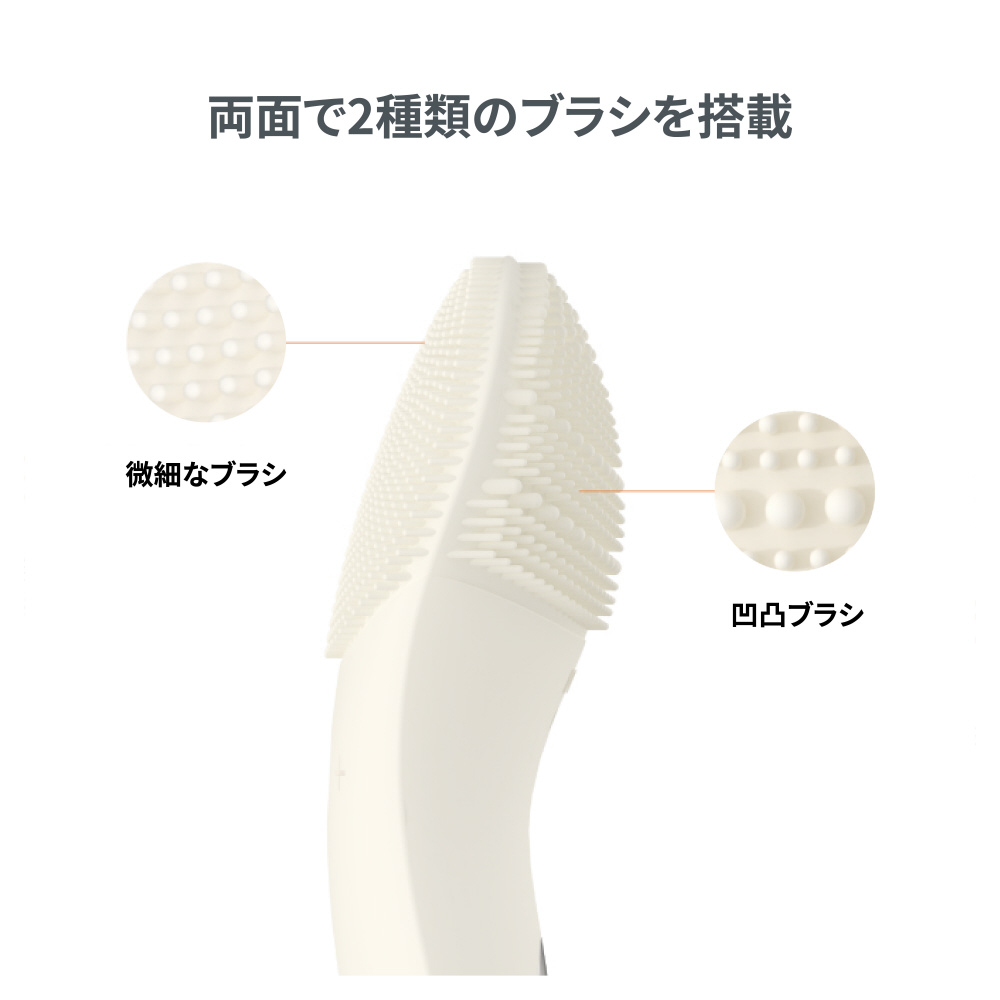 表面の微細なブラシは集中ケア、裏面の凹凸ブラシは広範囲洗浄が可能。メイク落としから毛穴ケアまで1台で完結するマルチ設計です。