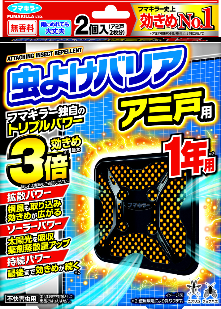 ●アミ戸に貼っておくだけで、窓等からのイヤな虫の侵入を長期間防ぎます。●横風も取り込み効きめが広がる独自開発の「ウインドキャッチ構造」を採用。容器に対して横方向の風を取り込み、より効率的に薬剤を蒸散させます。●黒色ボディと黒色ネットが太陽光を吸収して温度が上昇。薬剤蒸散量が増加し、効きめは最大3倍※にアップします。※直射日光照射時(夜間時との比較、気象条件により異なる場合があります。)●使い終わりまで虫よけ効果を発揮します。※使用環境により異なります。