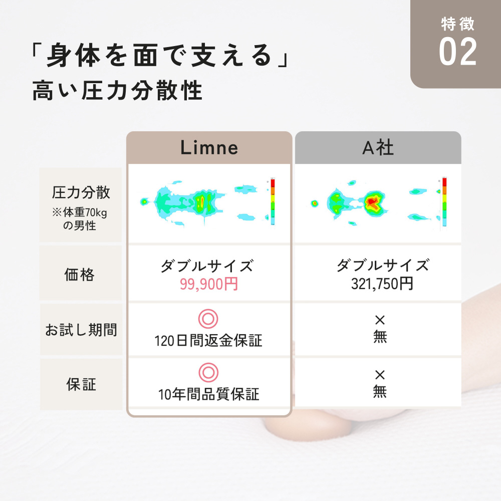 身体の一部に体重や圧がかかりすぎてしまうと、身体への負担が大きくなり、痛みを伴うことがあります。リムネマットレスは、独自の三層構造が面で包み込むように支えるため、生たまごでも潰れないほどの圧力分散性を実現しました。