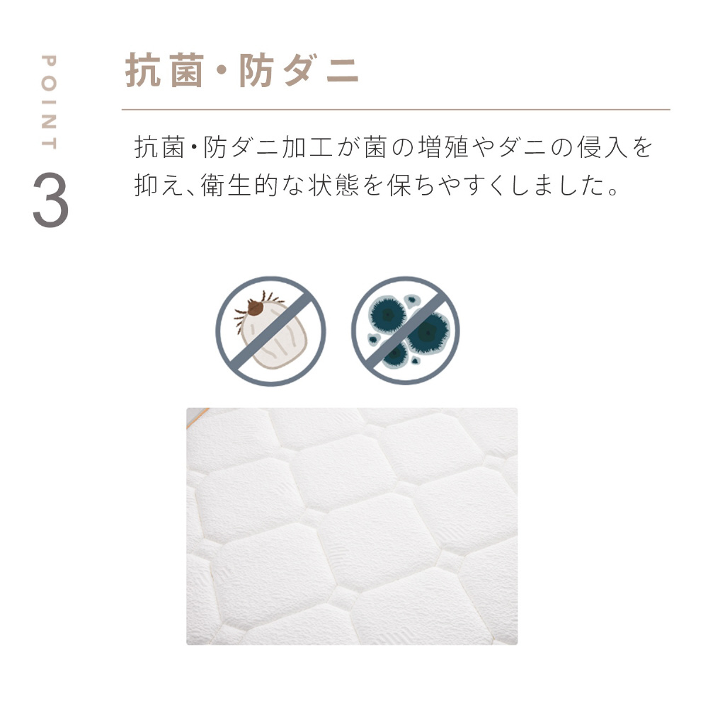 さらに抗菌・防ダニ加工により、菌の増殖やダニの侵入を抑え、衛生的な環境を保ちます。