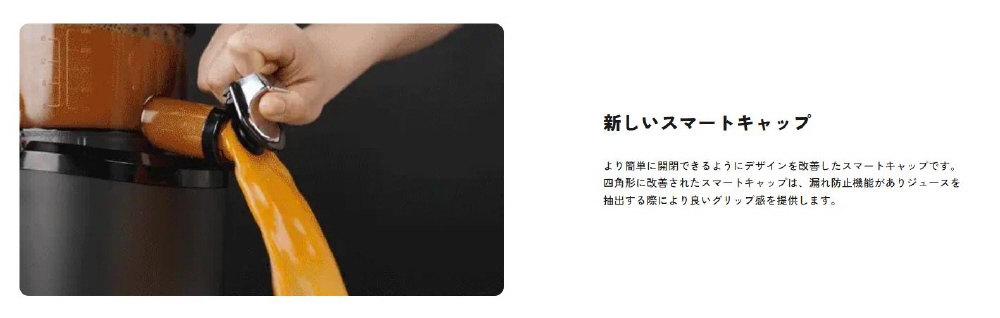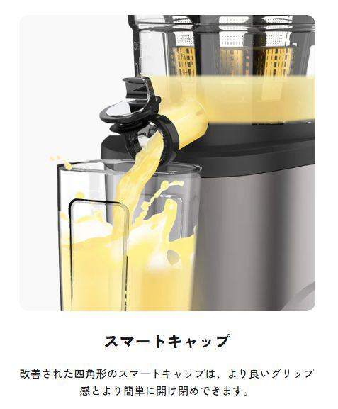 より簡単に開閉できるようにデザインを改善したスマートキャップです。 四角形に改善されたスマートキャップは、漏れ防止機能がありジュースを抽出する際により良いグリップ感を提供します。
