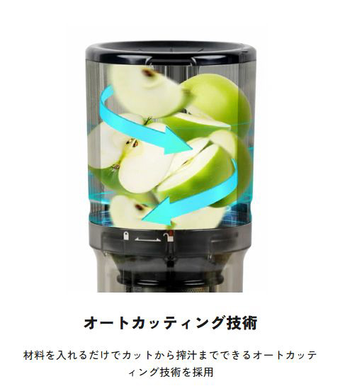 搾汁中に他の作業ができるから効率的に時間活用&材料を入れるだけでカットから搾汁までのオートカッティング技術。