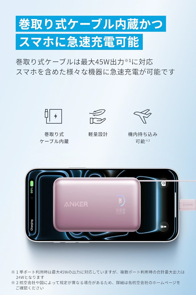 巻取り式ケーブルは最大45W出力に対応し、スマホを含めた様々な機器に急速充電が可能です。
