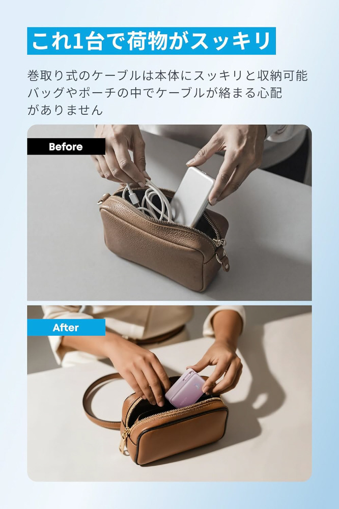 巻取り式のケーブルは本体にスッキリと収納可能です。バッグやポーチの中でケーブルが絡まる心配がありません。
