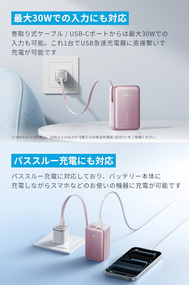 巻取り式ケーブル / USB-Cポートからは最大30Wでの入力も可能です。これ1台でUSB急速充電器に直接繋いで充電が可能です。