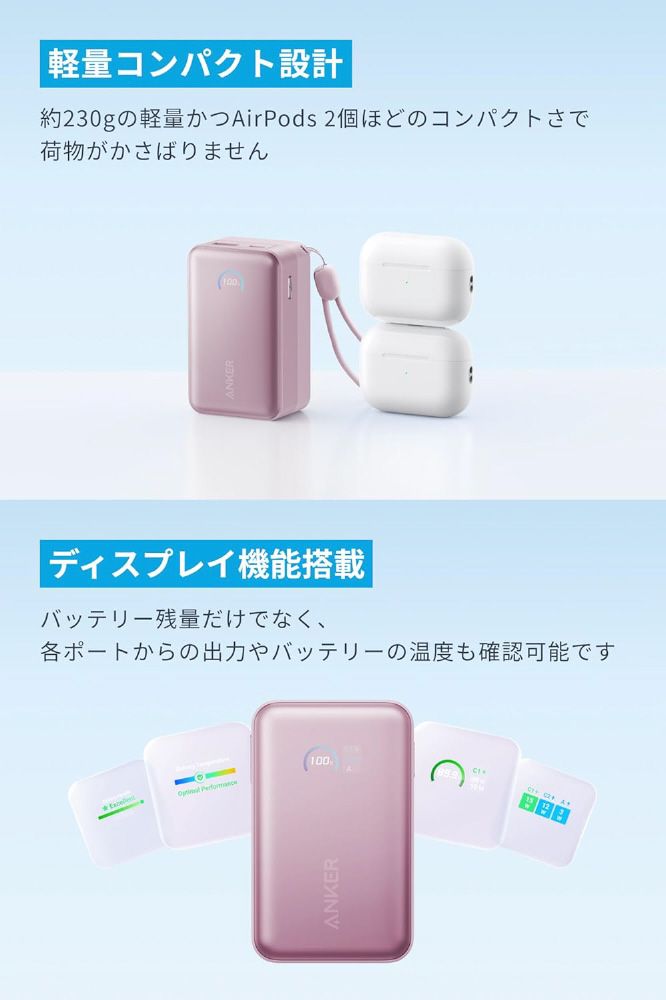 モバイルバッテリー Nano Power Bank (10000mAh、45W、巻取り式 USB-Cケーブル) ピンク A1638N51 [USB Power Delivery対応 /2ポート]