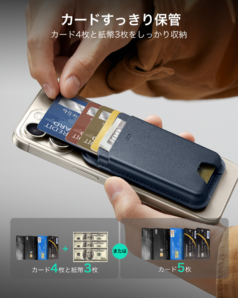 仕様2 MagSafeウォレットは、最大5枚のカード、または4枚のカードと3枚の紙幣の収納を行えます。