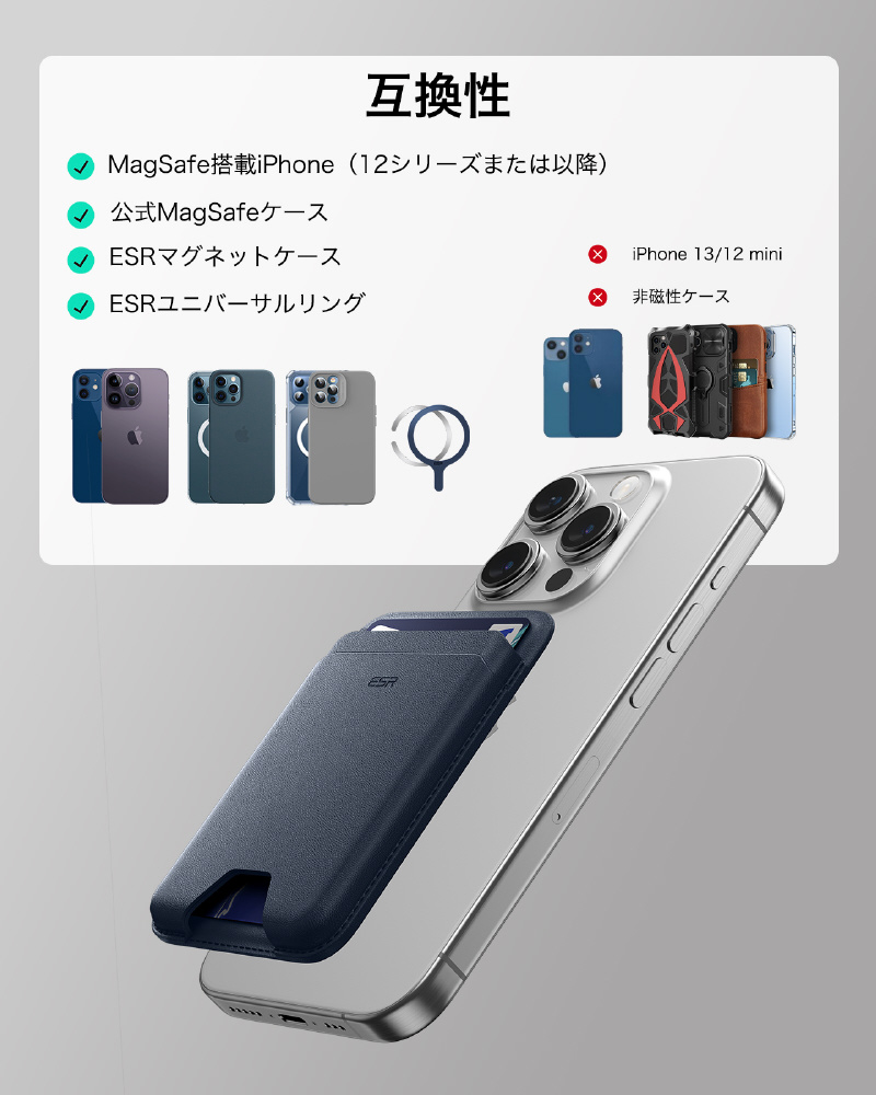機種 iPhone17/Air/16/15/14/13/12、ESR HaloLockケース、公式MagSafe iPhone 17/Air/16/15/14/13/12ケース、付属のリング使用でGalaxy S25+/S25 Ultra/S24+/S24 Ultra/S23+/S23 Ultra、Pixel 10?7も対応。※iPhone 13/12 miniおよび通常版のGalaxy S25/S24/S23には対応していません。