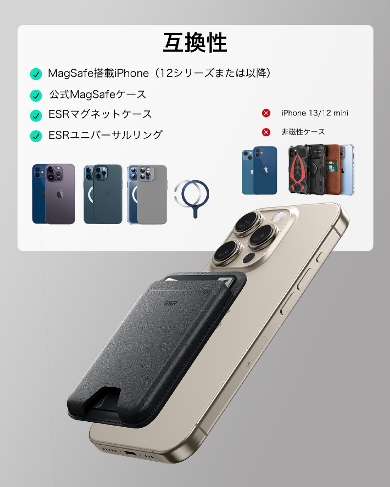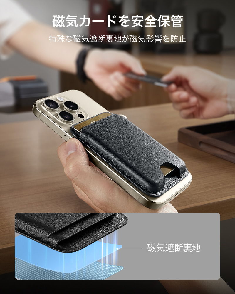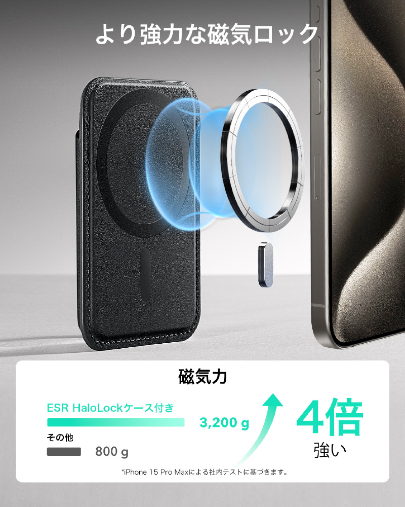 3,200gの保持力を発揮する20個の強力なN52磁石を使用したMagSafeウォレットは、Apple公式MagSafeウォレットの4倍の磁力を誇ります。ウォレットがしっかりと磁気吸着固定され、滑り落ちる心配もありません。