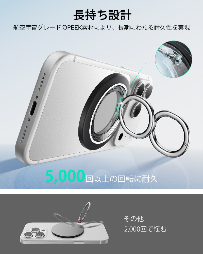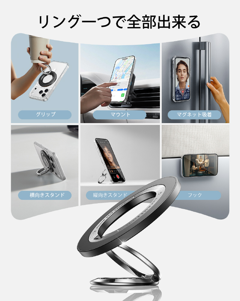 使用上のヒント: 1. 磁気電話グリップを側面からスライドさせて簡単に取り外せます。2. ワイヤレス充電の前にグリップを取り外します。3. 金属リングはワイヤレス充電に影響しません。