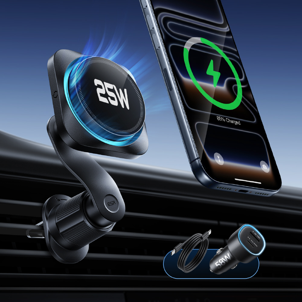 58W出力のUSB-A&USB-Cデュアルポート車載充電アダプター、及びUSB-C to USB-C(1メートル)ケーブル付きで、ワイヤレス充電で車内をすっきり保ちながら、便利な充電が行えます。