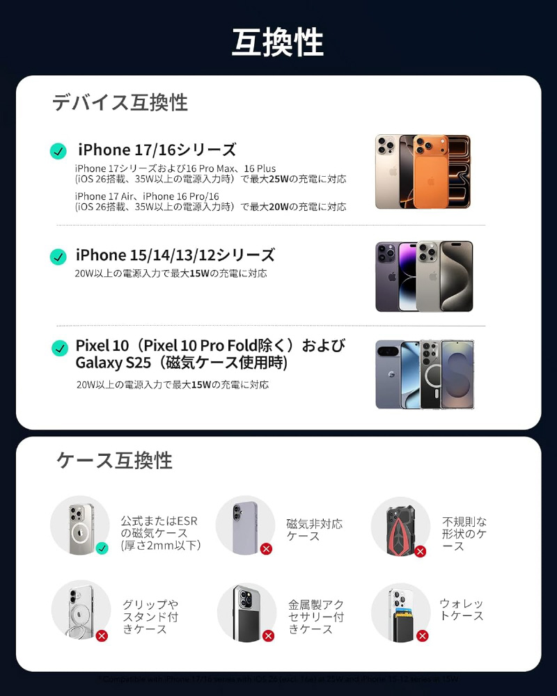 ◆15W急速充電はiPhone 15?12シリーズSE、miniシリーズ、16eを除く)、Google Pixel 10シリーズ(Pixel 10 Pro Foldを除く)、および磁気ケース装着時のGalaxy S25シリーズに対応し、20W以上の電源入力が必要です。