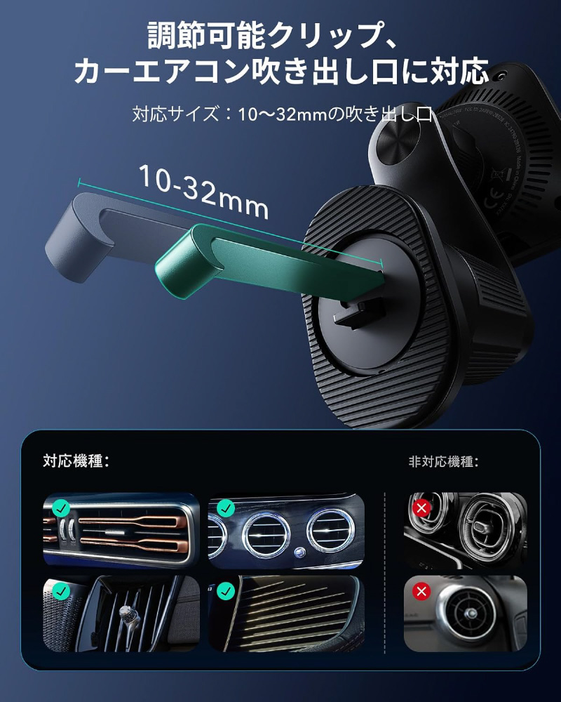 32mmまで伸縮する取り付けフックにより、大半の車種のカーエアコンルーバーに取付けれます。