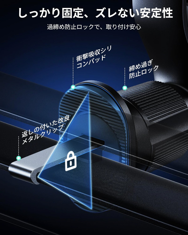 湾曲や緩みを防ぐ強化アルミ合金アームと、精密なボールジョイントとロッキングナットによる高い安定性で、揺れの多い悪路でもスマホを確実にホールドします。