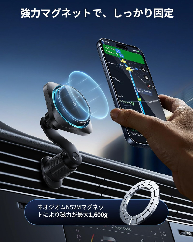 強力なN52磁石により、スマホをしっかり固定。デコボコした悪路でも揺るがない安定性を実現します。