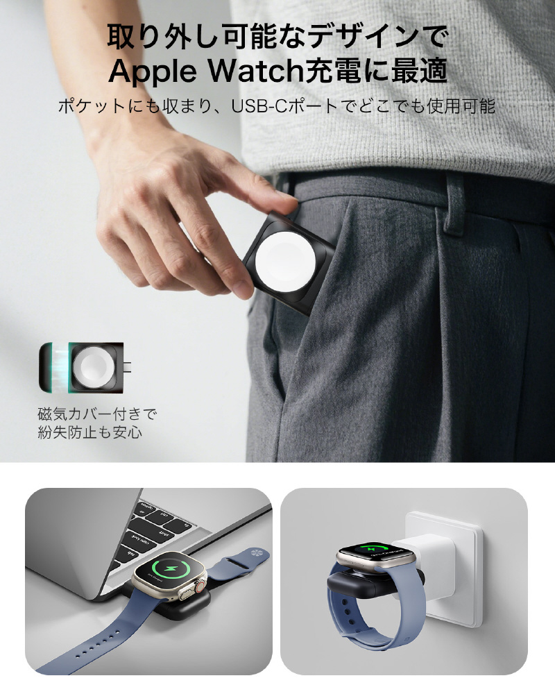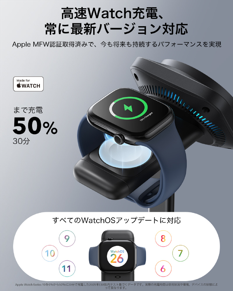 AppleのMFW認証を受けた第2世代の充電器搭載で、より速く信頼性の高い充電を体験可能。Apple Watch S10は30分で50%充電できます。磁気式のウォッチ充電モジュールは着脱可能で、USB-C接続でどこでも使用可能。すべてのiOSアップデートに対応しており、バージョン更新による買い替えが不要になります。