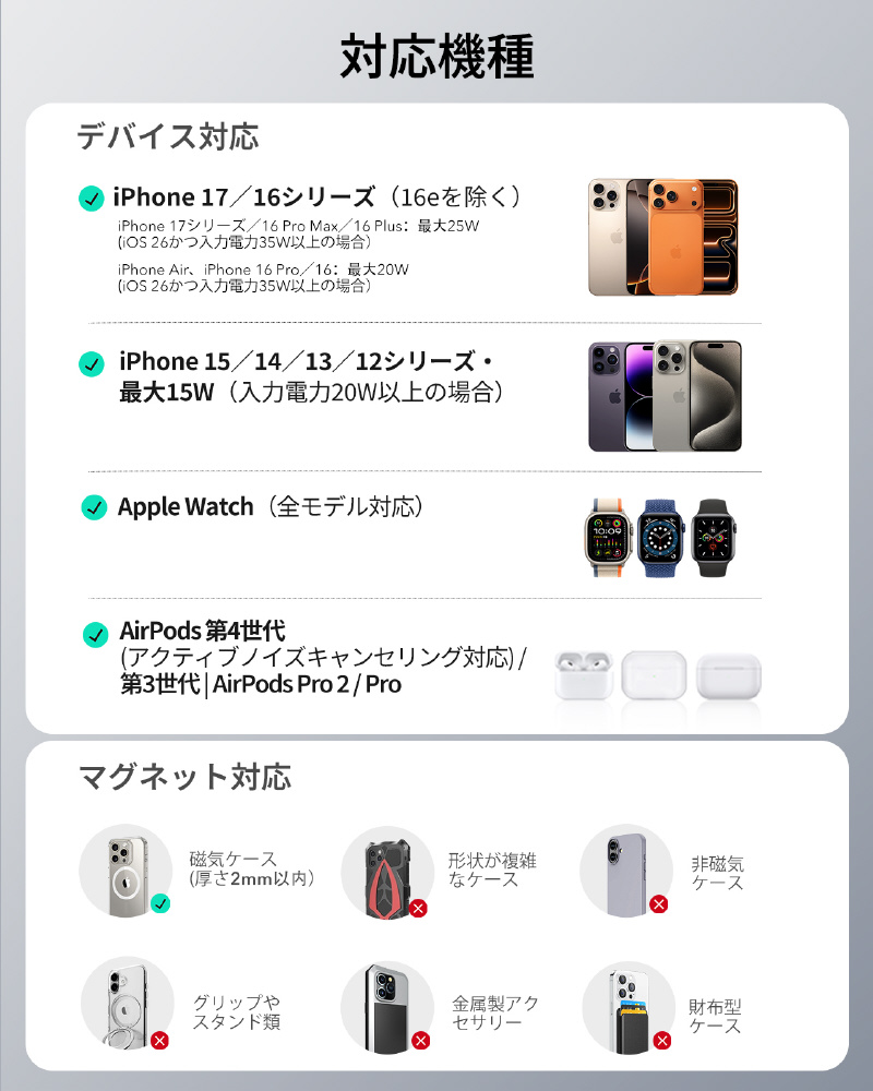 スマホ:QI2.2 25W:iPhone 17/17 Pro/17 Pro Max/16 Plus/16 Pro Max(iOS 26以降搭載)