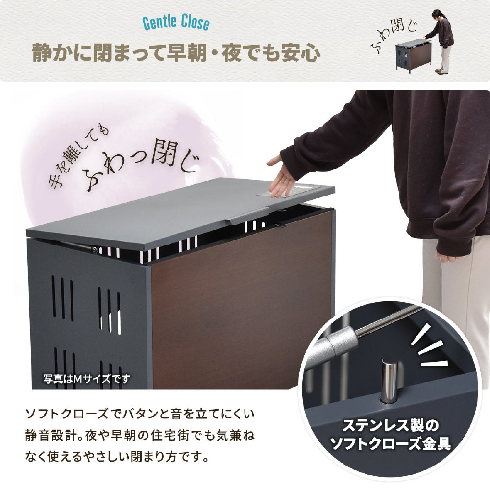ガス圧ダンパーで片手で軽々開き、重いゴミ袋も出し入れラクラク。
