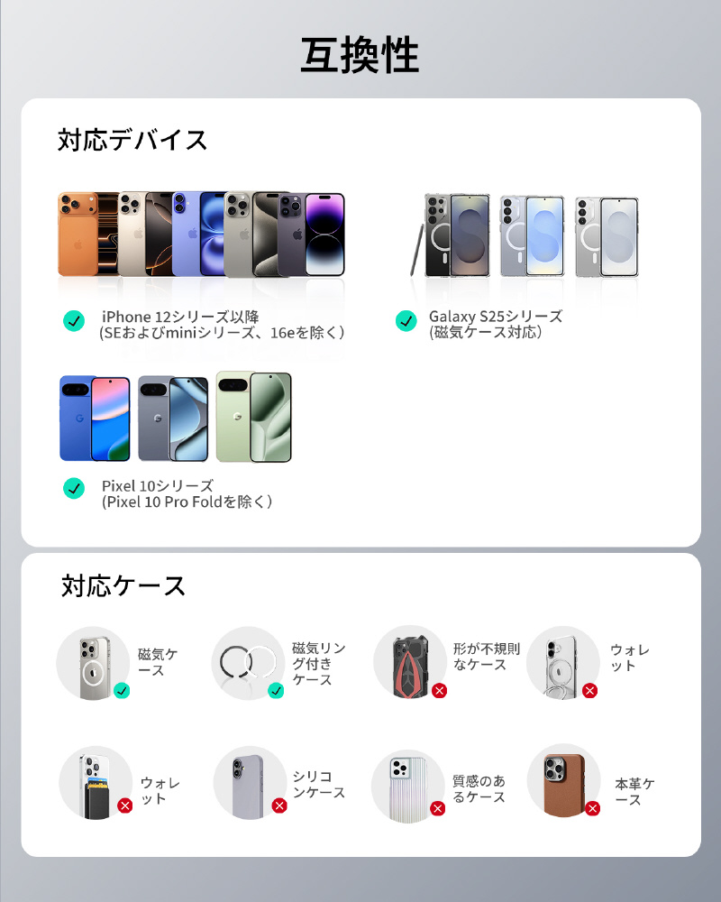 非対応:不規則な形状のケース、グリップ/スタンド付きのケース、ウォレットケース、従来のシリコンケース、テクスチャ加工されたケース、レザーケース (磁気リングが組み込まれている場合を除く)。