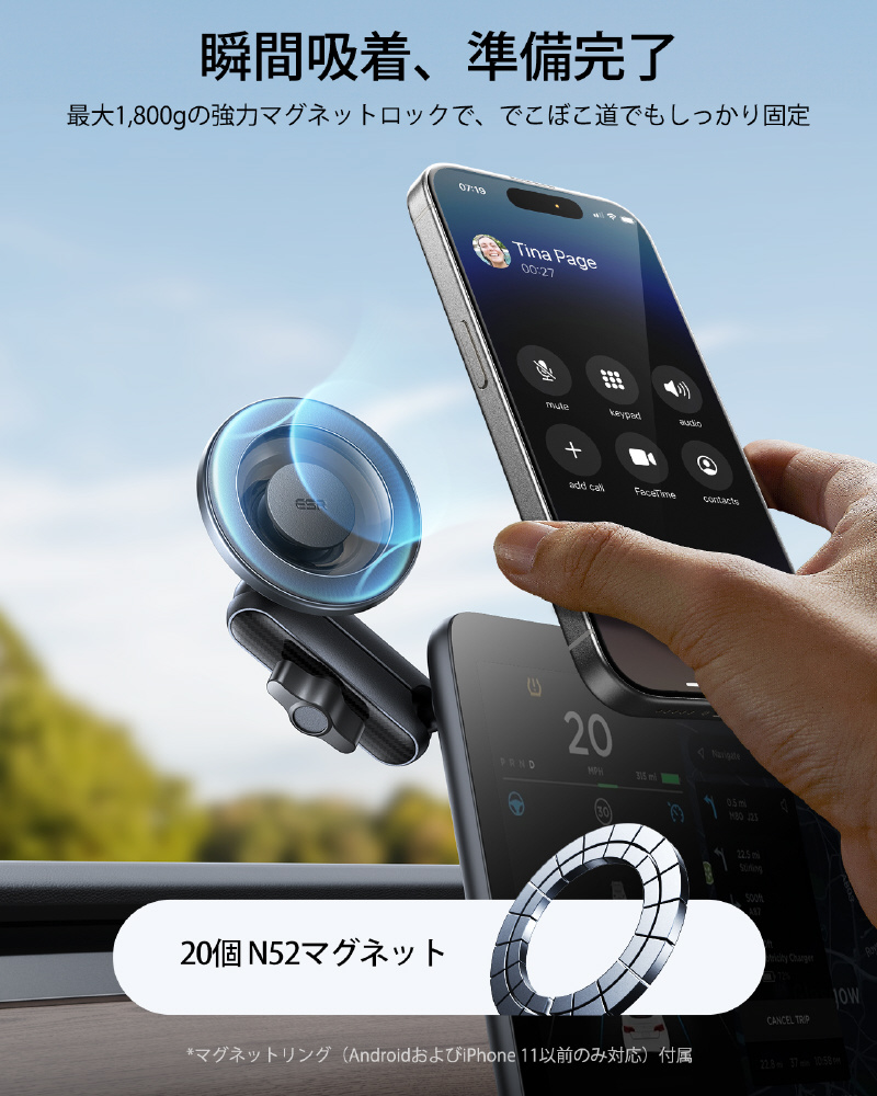 このマグネット式スマホ車載ホルダーは、20個の強力なN52磁石を使用しており、磁力は1,800gです。さらにESRのMagSafeケース使用時には2,100g、付属のマグネットリング使用時には3,750gまでアップします。この強力な磁力ででこぼこ道でもしっかりスマホを固定しつつ、通話やナビの電波を妨げることもありません。スマホをカチッと装着するだけで、ハンズフリーでの快適な画面操作やナビ利用が可能です。