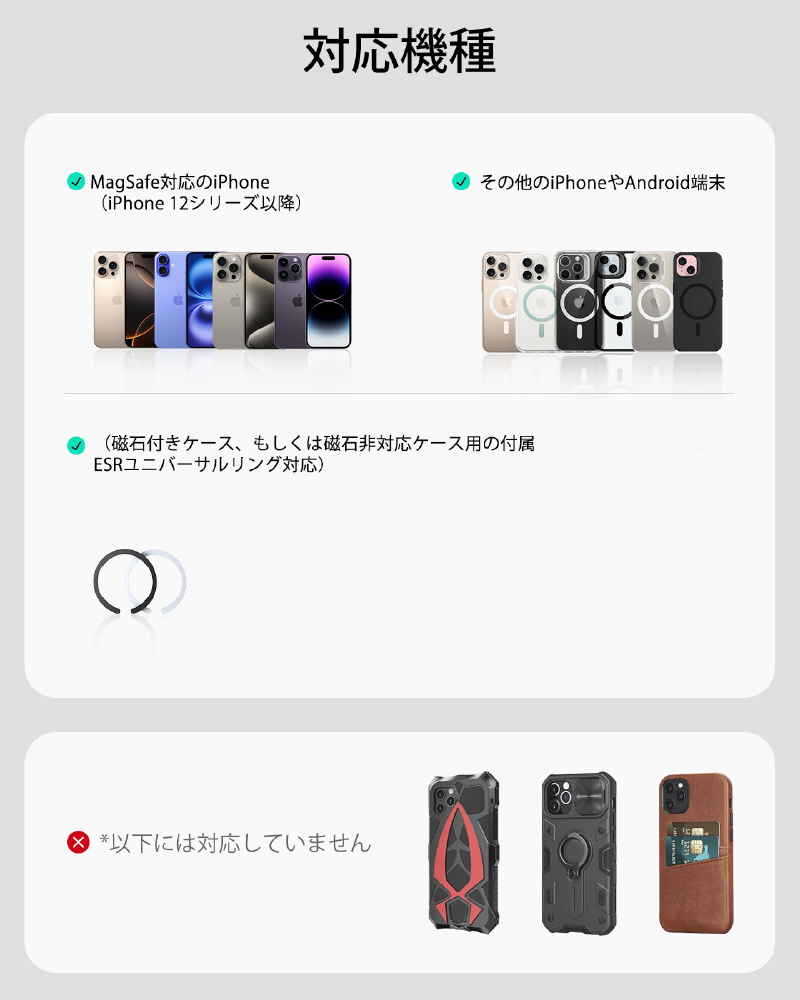 ※MagSafe非対応のスマホ・ケースでも付属の磁気リングを使えば利用可能です。