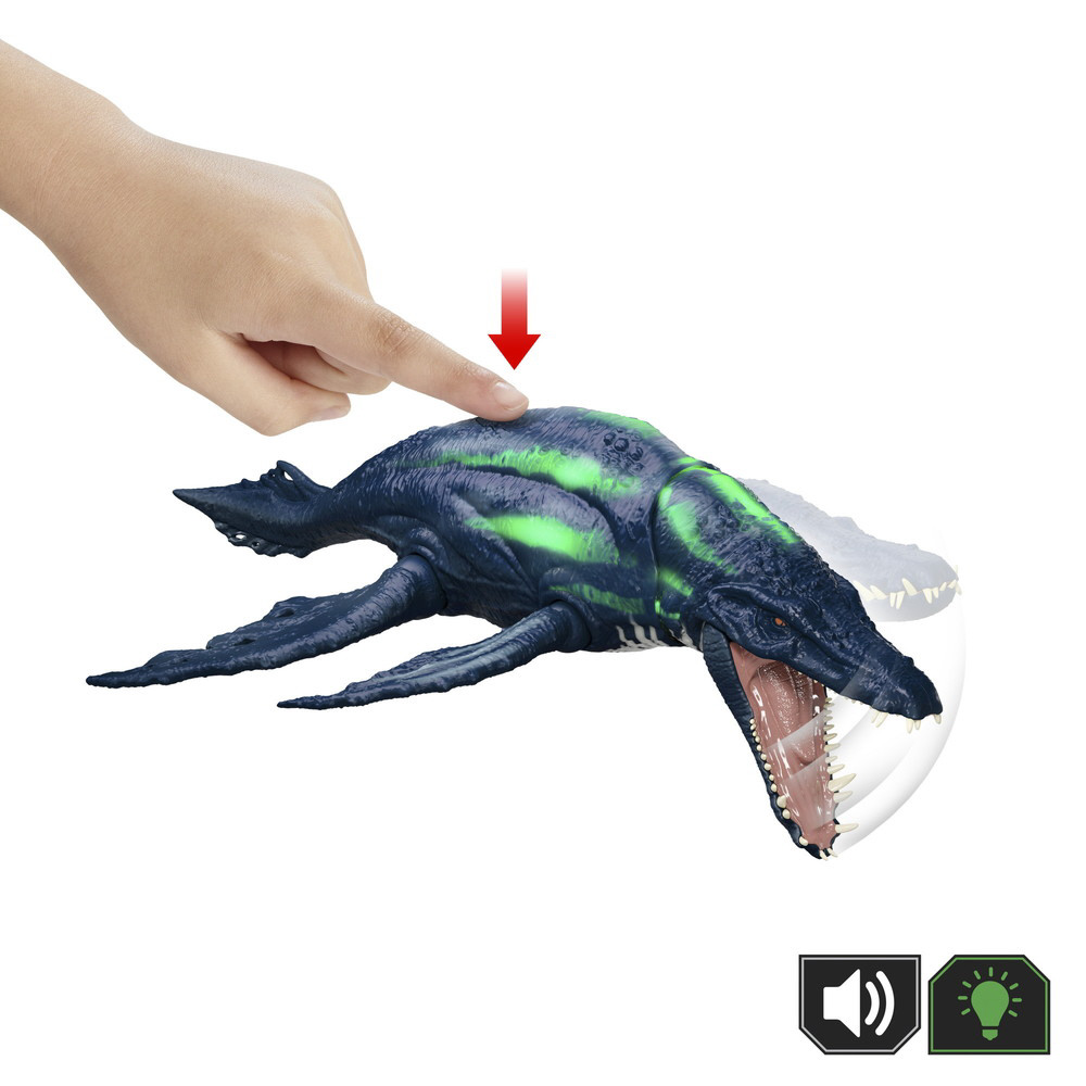 くちが動くアクションに加え、ボタンを押すと恐竜がひかってほえるので、恐竜バトルが楽しめます。