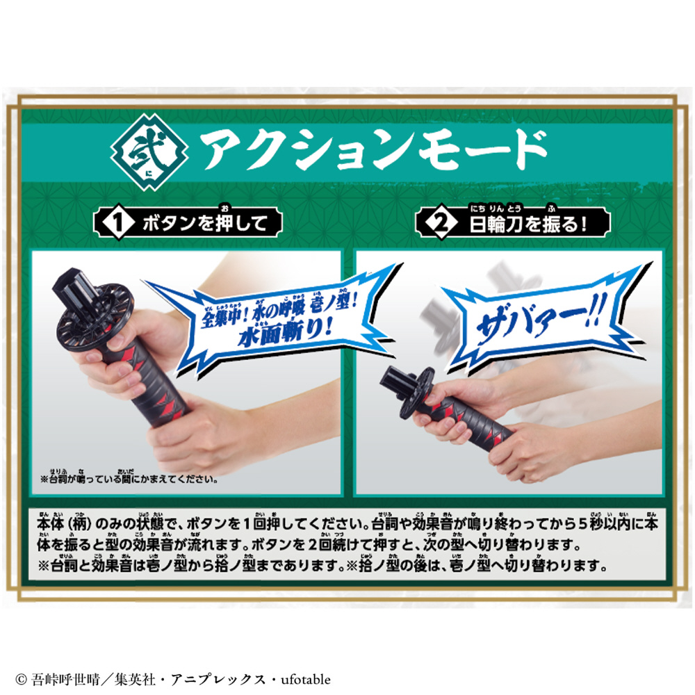 本体(柄)に刀身がついていると「水の呼吸モード」になり、ボタンを押して台詞と効果音を再生し、なりきり遊びが楽しめます。