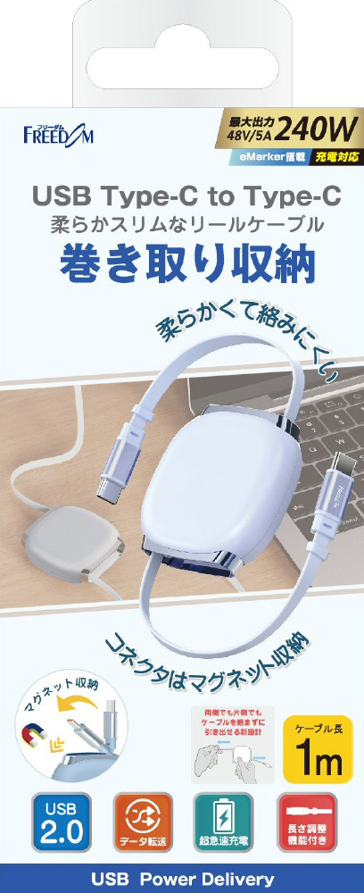 USB-C ⇔ USB-Cケーブル [充電 /転送 /リール〜1.0m /PD240W /USB2.0] スターシーブルー FUSB-CCAR241BL [USB-C ⇔ USB-C]