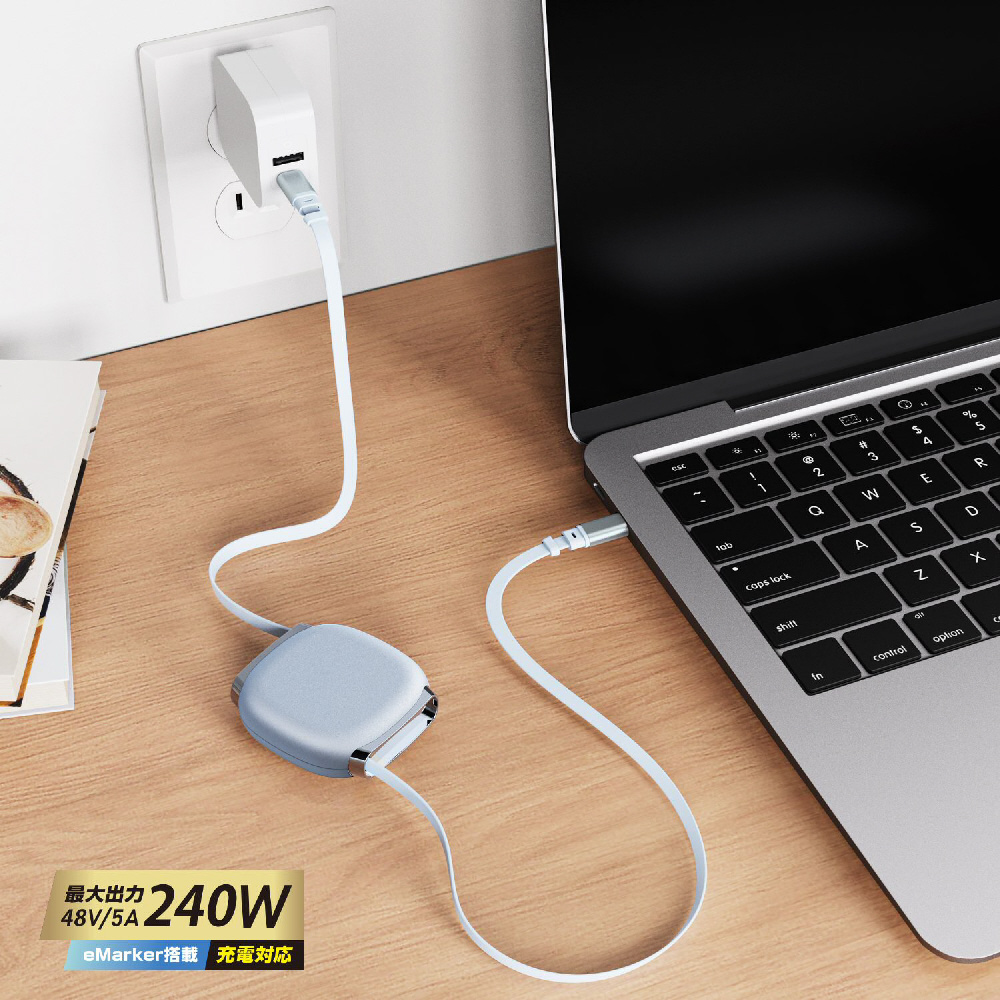 両側・片側どちらからでも絡まずに引き出せる、柔らかスリムなリール式ケーブルです。最大240WのUSB Power Delivery EPRに対応し、大電力が必要な機器への高速充電やデータ転送が可能です。軽量かつコンパクト設計で、使用後はコネクタをマグネット吸着でコンパクトに収納できます。