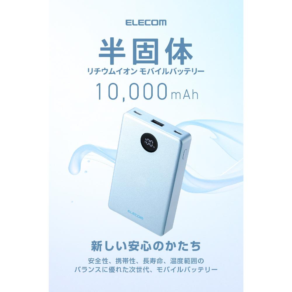半固体リチウムイオン電池を採用し、高い安全性・長寿命・幅広い使用温度範囲・高い携帯性を備えた、10000mAhのモバイルバッテリーです。