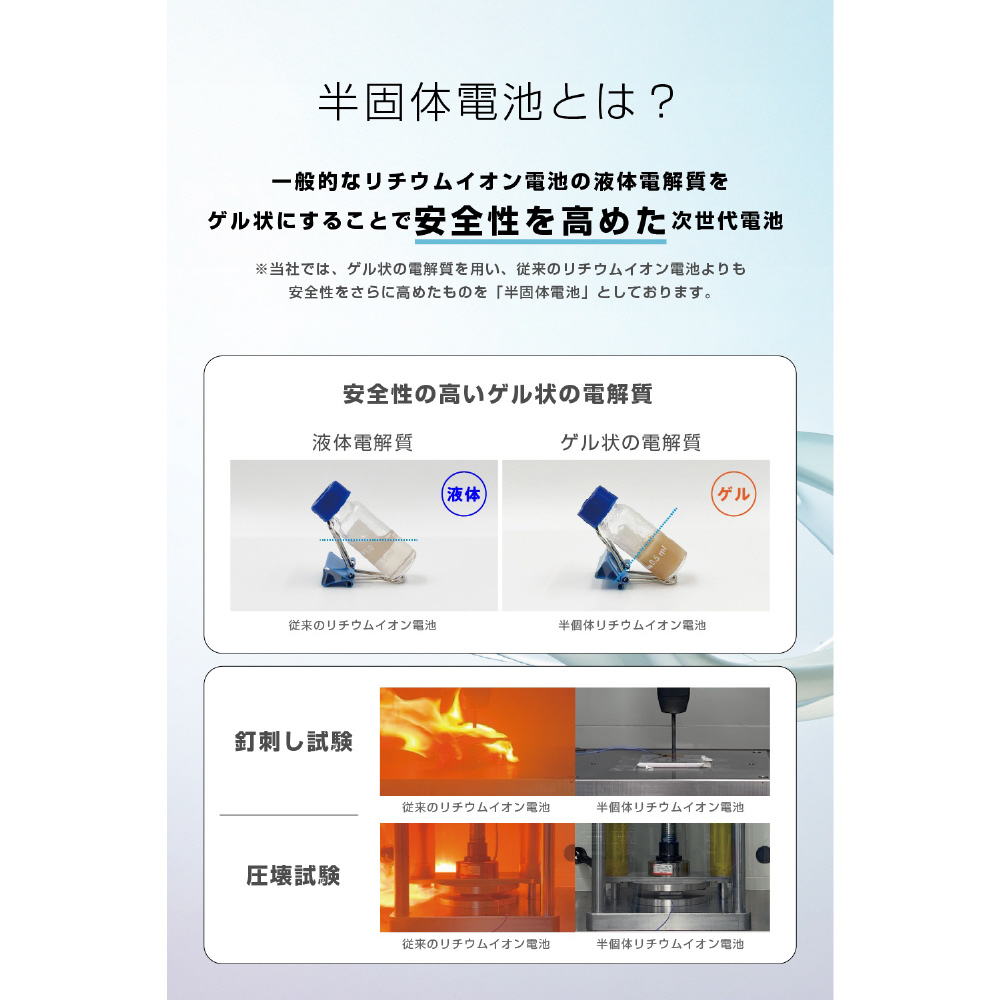 半固体電池は、電解液のゲル化により液漏れを防ぎ、可燃性有機電解液の使用量を低減することで、内部短絡時の可燃性ガスの発生・放出を抑制し、安全性を高めます。