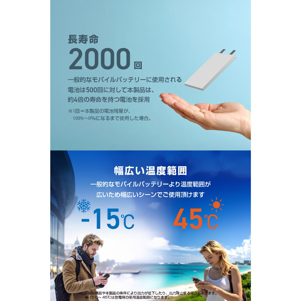 従来の一般的なモバイルバッテリーの放電温度範囲は0℃〜40℃ですが、本製品は-15℃〜45℃まで対応。 幅広い温度環境で使用できるため、猛暑や極寒の土地でも安心して使えます。
