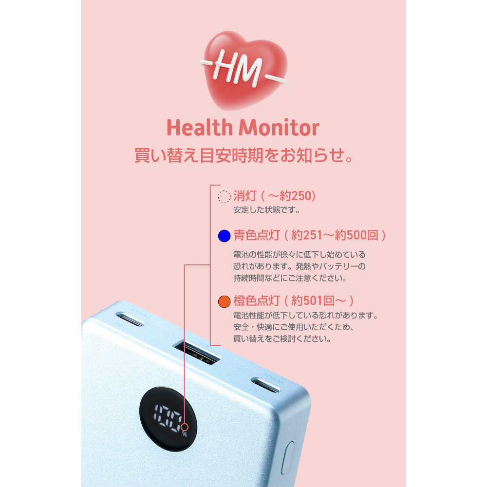 充放電回数に基づいて、電池の健康状態を自動で診断してLED表示する“Health Monitor”機能を搭載しています。買い替えや点検の目安として活用できます。