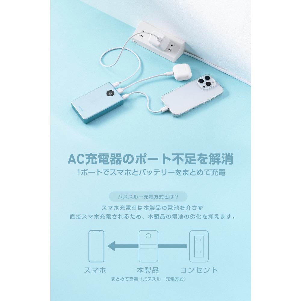 ※本製品はパススルー充電に対応し、バッテリーを介さずに充電器から接続機器へ直接充電するため、電池の劣化を抑えられます。
