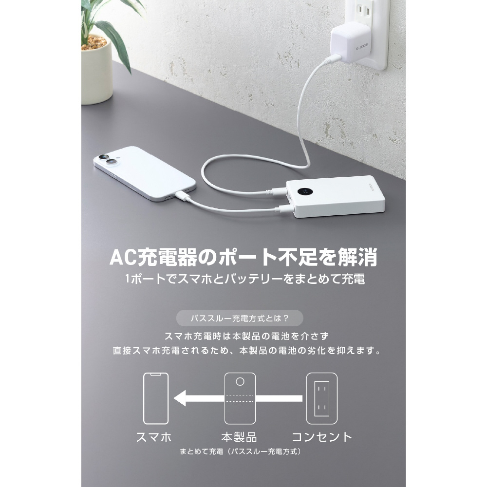 ※本製品はパススルー充電に対応し、バッテリーを介さずに充電器から接続機器へ直接充電するため、電池の劣化を抑えられます。