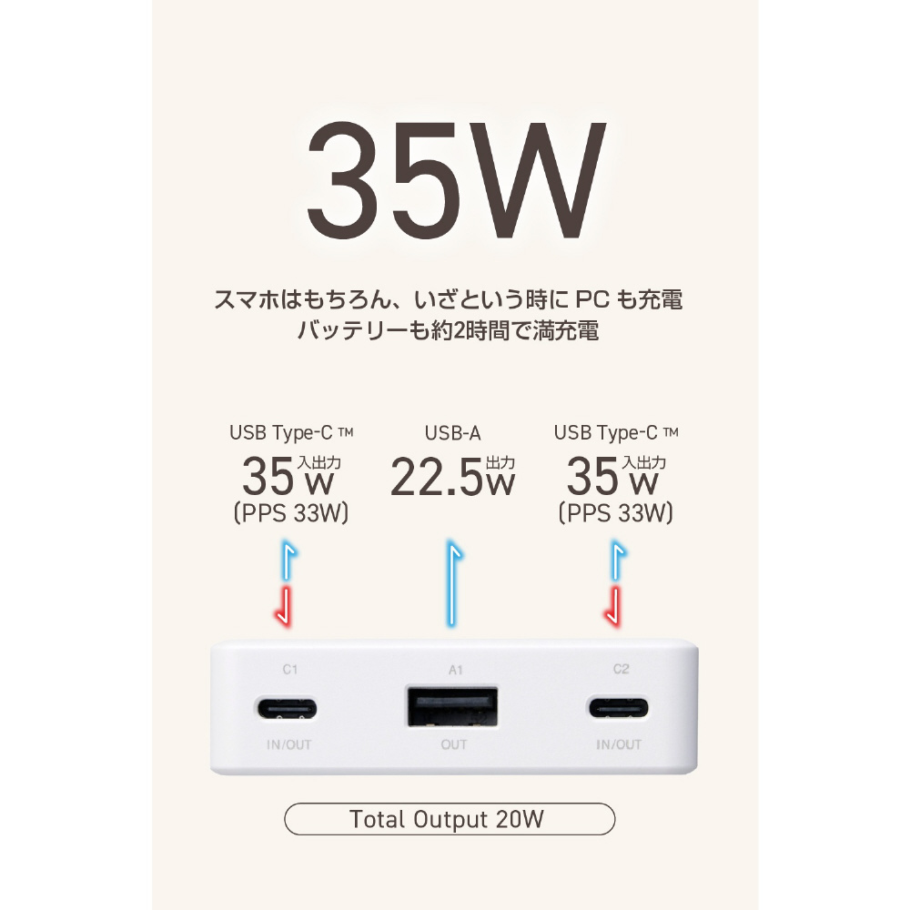 USB Type-Cポートの単独使用でUSB Power Deliveryの最大35W(PPS最大33W)出力が可能。スマートフォンやタブレットはもちろん、Macbook Airなどのノートパソコンも充電できます。