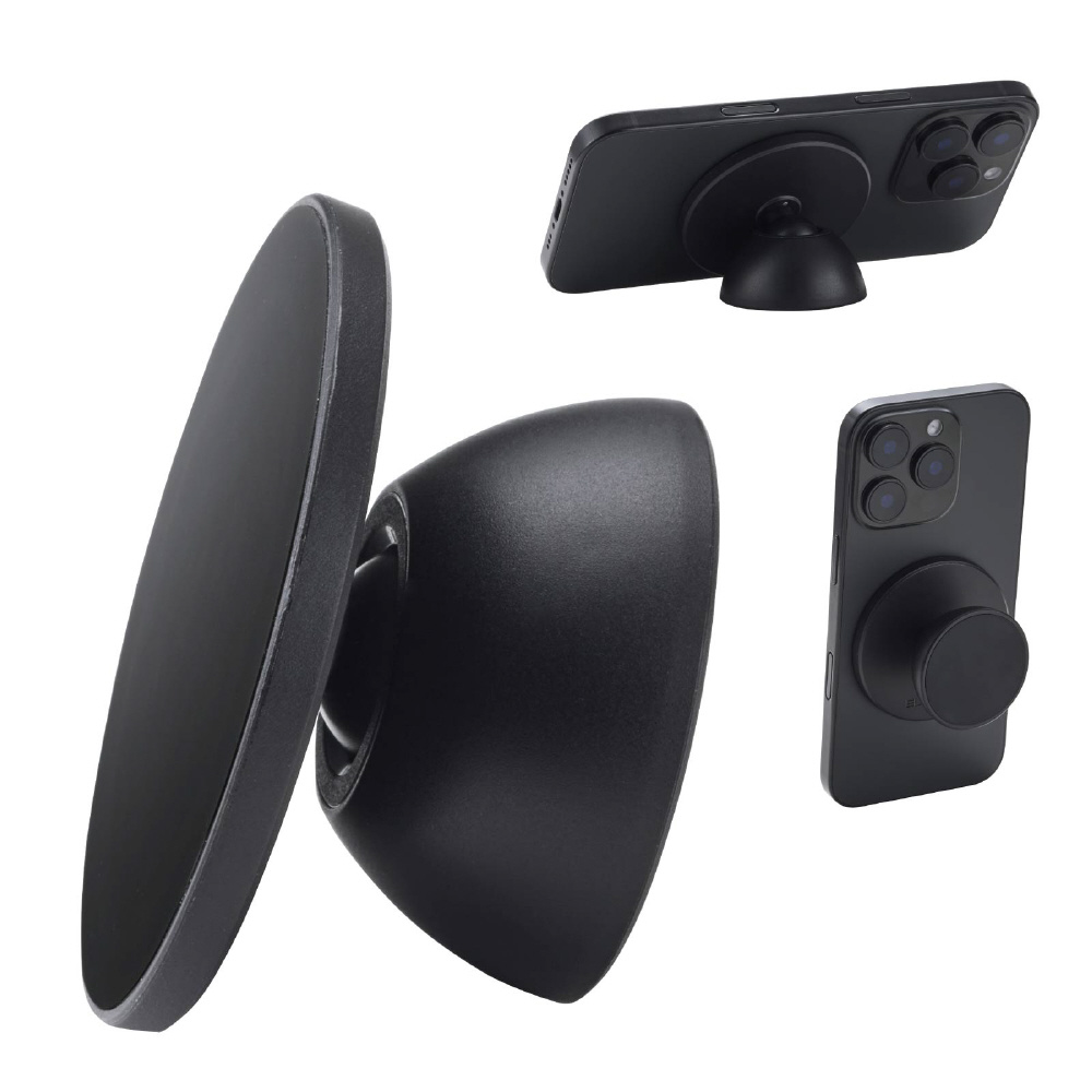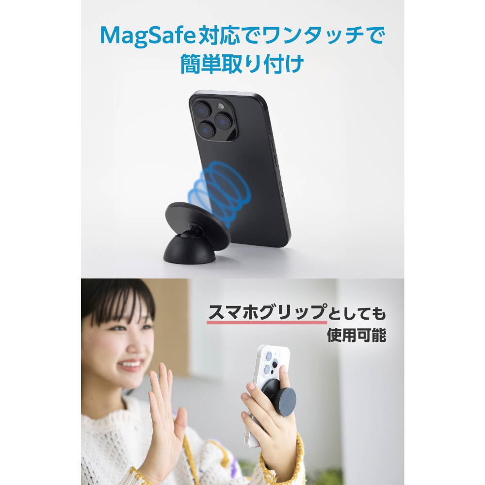 MagSafe対応 スマホスタンド スマホグリップ 両面マグネット キッチン・冷蔵庫・壁にマグネット固定 自撮り・ダンス動画・動画視聴 iPhoneなどスマホ用 メタルプレート付属 ブラック P-DSMMWBK